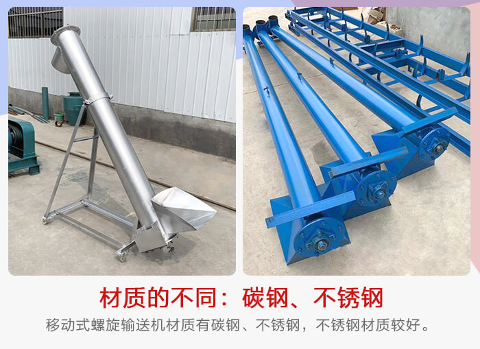 移動式螺旋輸送機材質有碳鋼、不銹鋼,不銹鋼材質的價格要貴1倍左右,不銹鋼的主要用于對輸送環境要求高的行業,清潔度高,不會污染物料,使用時間長,造價也相對高。碳鋼材質可以主要應用在一些對物料要求不是很嚴格或對,螺旋輸送機的衛生沒什么特別要求的地方,例如:一些煤炭,石灰,石子等一些顆粒狀的行業。