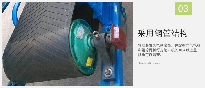 采用鋼管結構,輕巧美觀,機動性好。轉動裝置為電動滾筒,并配有充氣輪胎和鋼輪兩種行走輪。機長10米以上且傾角可以調整。