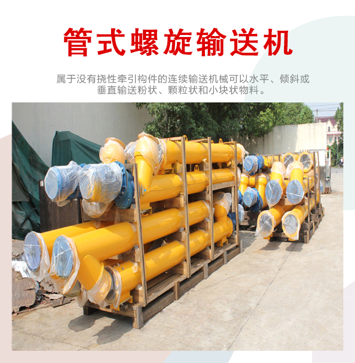 管式輸送機是一種電機帶動螺旋回轉,進而推移物料實現(xiàn)輸送目的的輸送設備,屬于沒有撓性牽引構件的連續(xù)輸送機械可以水平、傾斜或垂直輸送粉狀、顆粒狀和小塊狀物料。大漢管式輸送機可分為有軸管式輸送機和無軸管式輸送機,這兩者的區(qū)別在于無。送機更易于輸送粘性、纏繞性物料,可以按照用戶物料及應用場合要求設計為不銹鋼材質。能完成輸送、混合、攪拌、松散、加熱以及冷卻等工藝。