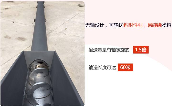 2、輸送量是相同直徑傳統(tǒng)有軸螺旋輸送機的1.5倍,單機輸送長度可達60米。