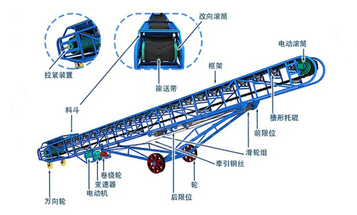 帶式輸送機(jī)主要由輸送帶、驅(qū)動裝置、滾筒、托輥、張緊裝置、清掃裝置等組成。輸送帶是輸送機(jī)的主體部件,用于承載物料并傳遞動力。驅(qū)動裝置通常包括電動機(jī)、減速器和聯(lián)軸器,提供動力驅(qū)動輸送帶運(yùn)行。滾筒用于支撐和傳遞輸送帶的運(yùn)動力,托輥支撐輸送帶并減少摩擦。張緊裝置用于調(diào)整輸送帶的張緊度,保持適當(dāng)?shù)膹埩ΑG鍜哐b置用于清除輸送帶上的雜物,保持輸送帶清潔。這些組成部分協(xié)同工作,使帶式輸送機(jī)能夠高效、穩(wěn)定地完成物料的輸送任務(wù)。